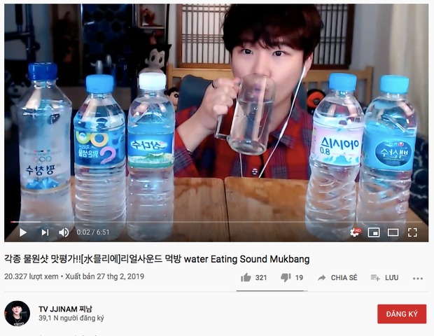 Không phải đùa đâu, mukbang nước lọc thực sự là trào lưu nổi tiếng ở Hàn Quốc, xuất hiện từ nửa năm trước nhưng phải cho đến thời gian gần đây mới gây hot trở lại. Các Youtubers Hàn còn kỳ công sản xuất 1 loạt các video mukbang những loạt nước lọc khác nhau, rồi dần dần thêm cả nước điện giải, nước khoáng vị trái cây…
