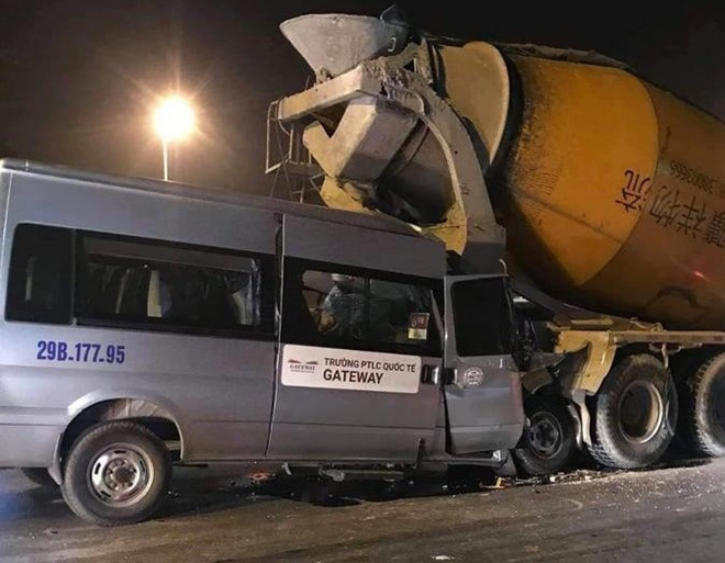 Ôtô 16 chỗ biển dán chữ Trường Quốc tế Gateway do anh Nguyễn Văn Tân (34 tuổi) lái theo hướng Khu công nghiệp Bắc Thăng Long đi cầu Đông Trù. Tới ngã tư Xuân Canh, ôtô này tông vào đuôi xe bồn trộn bê tông mang biển kiểm soát 29C đang dừng đèn đỏ.