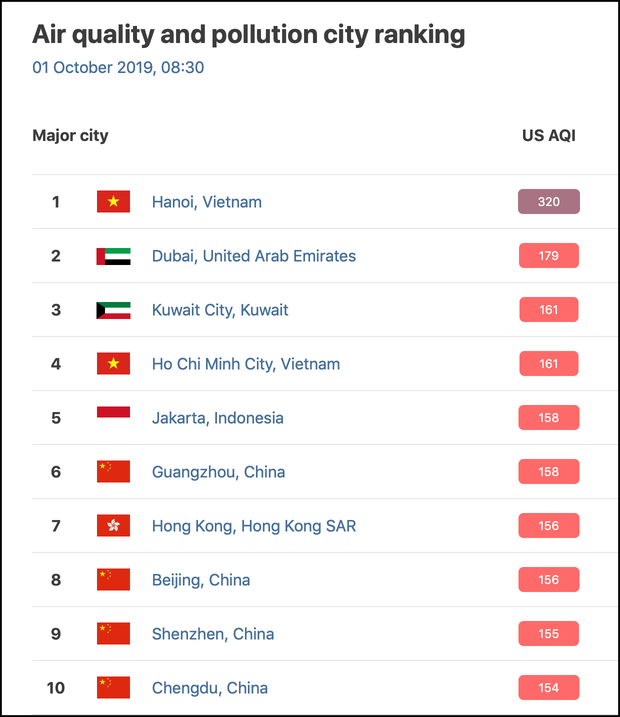 Theo dữ liệu từ IQAir AirVisual - Tổ chức đo chất lượng không khí thế giới, trong buổi sáng 1/10 Hà Nội là thành phố có chỉ số ô nhiễm cao nhất với chỉ số AQI là 320.