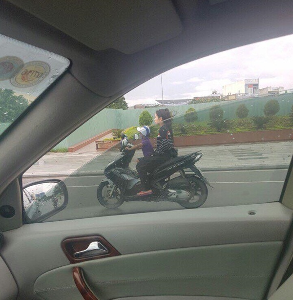 Hình ảnh người mẹ để con nhỏ lái xe máy trên đường.