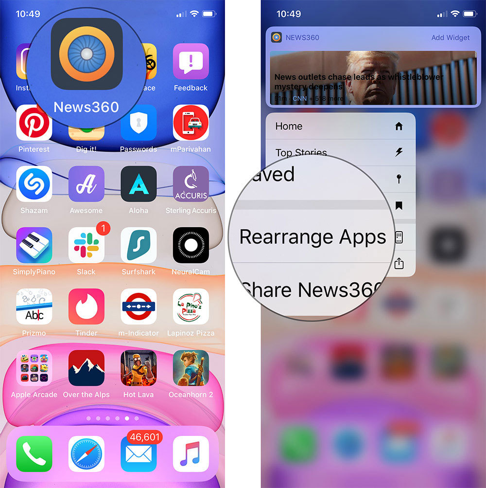 Bước 1: Bấm và giữ lên biểu tượng ứng dụng trên màn hình chính. Từ trình đơn ngữ cảnh, bạn chọn Rearrange Apps (Sắp xếp lại ứng dụng).