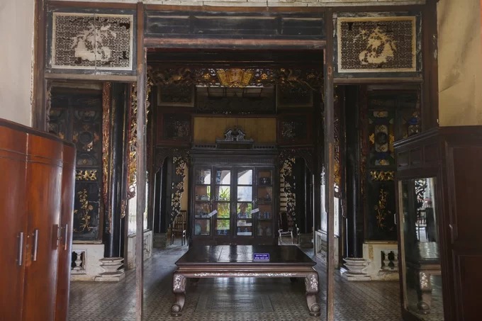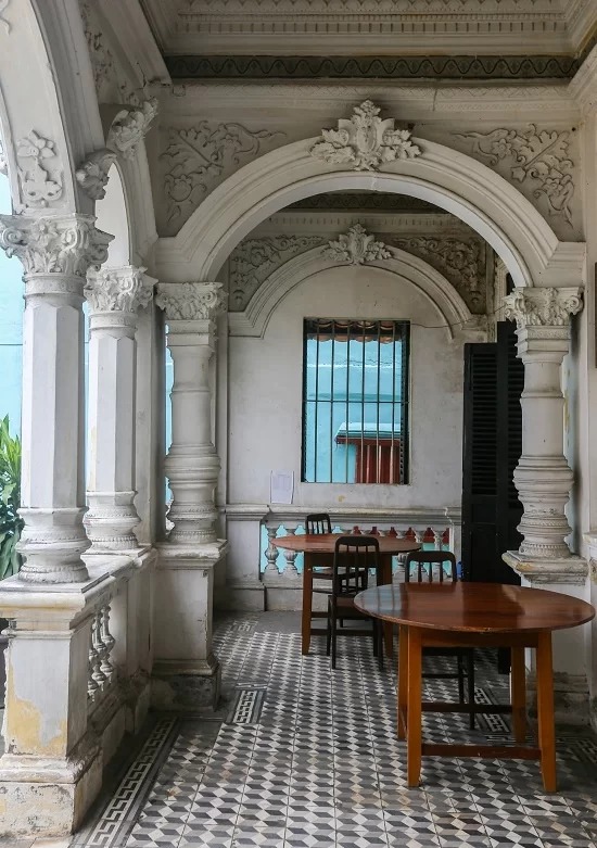 Hành lang căn nhà với cách xây dựng, lối kiến trúc đặc trưng như một biệt thự kiểu Pháp. Phần sàn được làm trũng về phía trung tâm theo phong thủy của người Hoa, với ư nghĩa “nước chảy về chỗ trũng”, tiền bạc sẽ đổ về nhà.