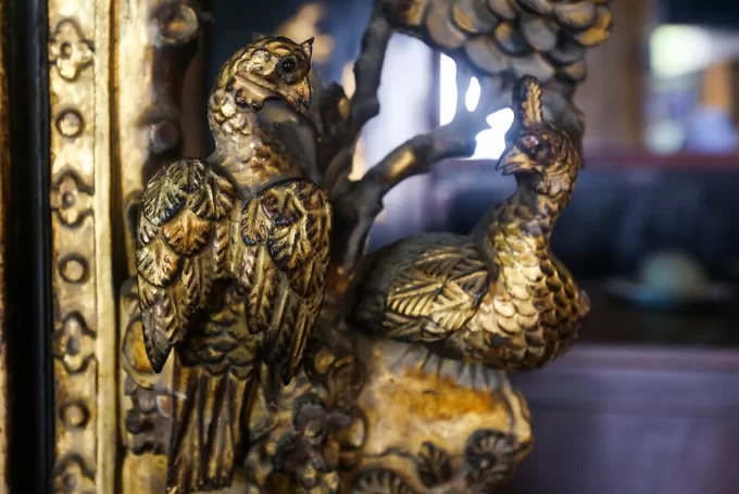 Những trạm trổ rồng phượng, chim công, mai, lan, cúc, trúc... tinh xảo theo văn hóa phương Đông nổi bật ở pḥng khách. Màu vàng thể hiện cho sự quyền quư của chủ nhân căn nhà.