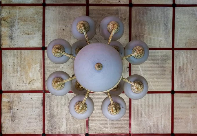 Những đồ dùng trong nhà như bàn ghế, đồ thờ, đồng hồ, gương... vẫn nguyên vẹn. Trên trần pḥng khách là chiếc đèn chùm kiểu Pháp.