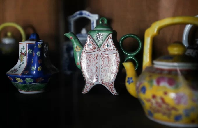 Những bộ ấm trà, bát đĩa, ly tách... có tuổi đời cả trăm năm vẫn nằm nguyên vẹn trong tủ kính của ngôi nhà cổ.
