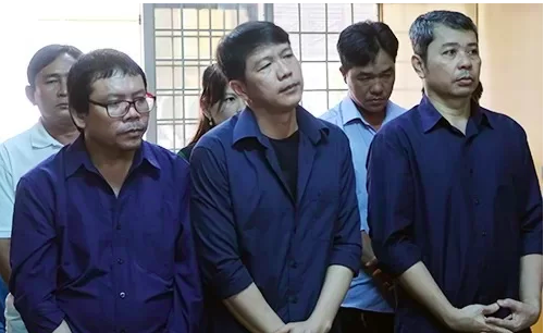 Các bị cáo Thới, Chân, Thái tại tòa sơ thẩm. Ảnh: Lan Ngọc.