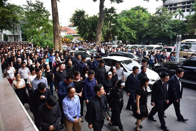 Thân quyến của Thứ trưởng GD&ĐT Lê Hải An cùng đại diện các cơ quan ban ngành, trường đại học, đồng nghiệp, học trò cũ xếp hàng chờ vào viếng. Ảnh: DT.