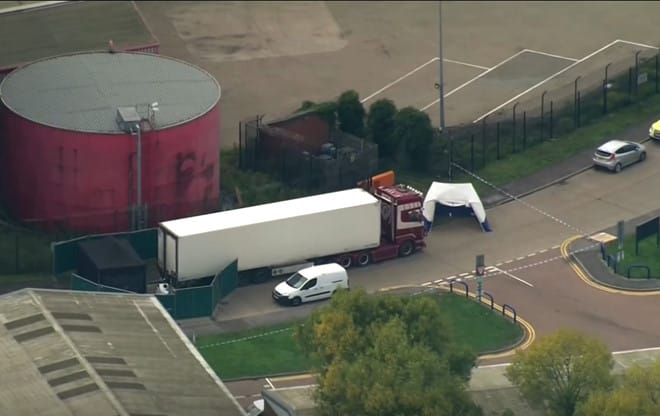 Chiếc container phát hiện 39 người đã tử vong, tại hạt Essex (London, Anh). (Ảnh chụp video)