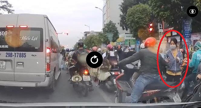 Theo đó, khi thấy các phương tiện dừng chờ đèn đỏ thì một cô gái trẻ mặc áo chống nắng, đeo khẩu trang đi ra phát tờ rơi cho mọi người. Đáng chú ý, khi cô gái đang định đưa tờ rơi cho một người đàn ông đi xe máy thì người này bất ngờ vươn tay định sàm sỡ cô.