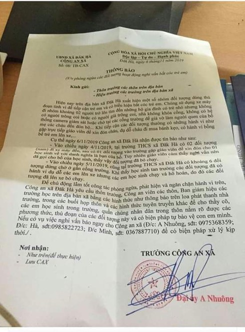 Đến ngày 5/11, có khoảng 6 đối tượng đứng chờ gần cổng Trường THCS xã Đắk Hà. Khi thấy học sinh tan trường, nhóm này đã dụ dỗ một số học sinh lên xe nhưng 1 học sinh đã bỏ chạy và hô hoán mọi người xung quanh nên bọn chúng bỏ đi nơi khác.