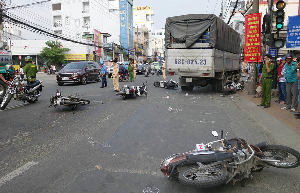 Xe tải đang chạy trên quốc lộ 91, đoạn qua TP Long Xuyên, An Giang thì bất ngờ tông 6 xe máy dừng đèn đỏ khiến nhiều người bị thương.