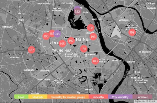 Sông Hồng lúc 11h mù trắng đục. Chỉ số ô nhiễm của Hà Nội ghi nhận bởi trang AirVisual ở mức rất có hại cho sức khỏe.