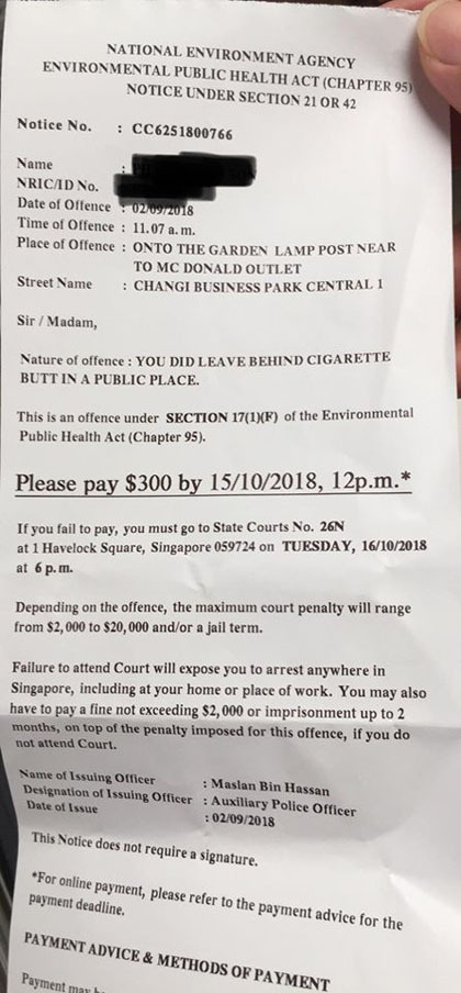 Trong khi anh Cường gặp sự cố khi mới đặt chân đến đảo quốc sư tử, rắc rối chỉ xảy đến Randy Nguyễn (TP HCM) vào ngày cuối cùng của chuyến đi. Ngày 2/9, trên đường ra sân bay về nước, Randy và bạn bè ghé qua Expo Outlet. Tranh thủ khi mọi người mua sắm, một thành viên trong nhóm ra khu vực hút thuốc. Tuy nhiên, anh sơ ý để rơi đầu lọc thuốc lá ra ngoài. Lúc đó, hai cảnh sát mặc thường phục đã quay video làm bằng chứng và ghi phiếu phạt 300 SGD (5,1 triệu đồng). Cảnh sát scan hộ chiếu và gửi phiếu phạt, du khách phải nộp tiền sau đó 3 ngày.