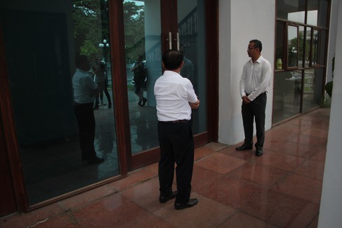 Các nhân viên nghiêm cẩn đứng chờ ông Vũ hơn nửa tiếng sau khi tòa tuyên hoãn.