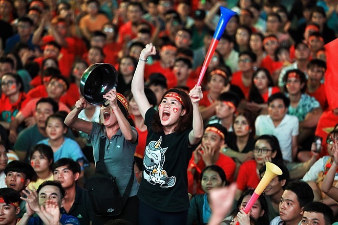 Người hâm mộ TP HCM cổ vũ cho đội tuyển Việt Nam trong trận đấu. Ảnh: Hữu Khoa.