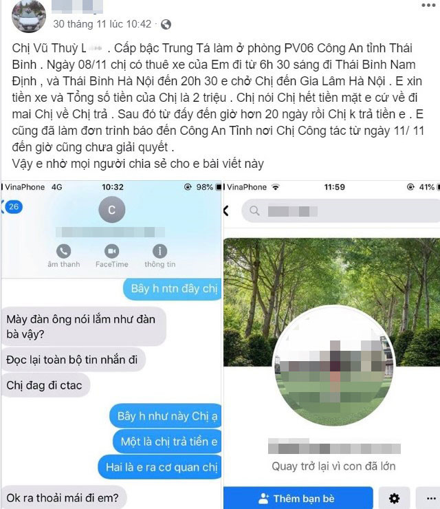 Một người đàn ông đã đưa lên trang cá nhân của mình việc tố nữ cán bộ công an quỵt tiền xe không trả dù đã đòi nhiều lần. Điều đáng nói là nữ trung tá này còn thách thức anh đưa vụ việc báo cơ quan. Dưới đây là những thông tin cụ thể. Nhiều lần đòi 2 triệu đồng tiền đi taxi của một trung tá Công an tỉnh Thái Bình không được, anh Hân gửi đơn đến công an, chia sẻ lên mạng chuyện bị quỵt tiền taxi, thu hút hàng ngàn lượt tương tác kèm bình luận bức xúc.