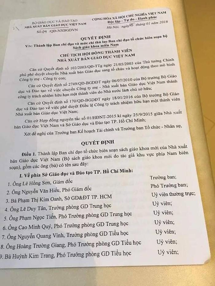 Văn bản số 778/QĐ-NXBGDVN ngày 29.9.2015 và 04/QĐ-NXBGDVN năm 2018 của NXB Giáo dục Việt Nam cho thấy Ban chỉ đạo biên soạn bộ SGK miền Nam thuộc Sở GD-ĐT TP.HCM gồm giám đốc, các phó giám đốc, chánh văn phòng, phó chánh văn phòng, các trưởng, phó phòng chuyên môn và các chuyên viên phòng chuyên môn đều nhận thù lao hàng tháng từ NXB GDVN, số tiền lớn nhỏ tùy thuộc vào chức vụ của mỗi người.