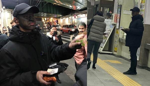 Chiều 7.12, tài khoản Facebook L.H chia sẻ ảnh nam thanh niên mặc đồ đen, bôi đen mặt cầm đĩa xin tiền gần ga tàu điện ngầm ở Nhật Bản. Nhiều người Nhật thấy lạ nên chụp ảnh và quay video anh chàng này.