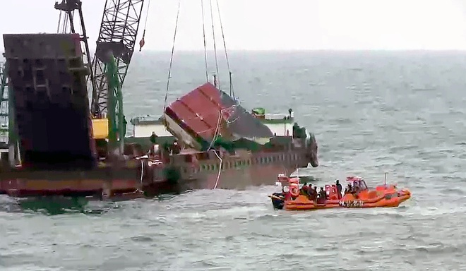 Lực lượng cứu hộ Hàn Quốc trục vớt phần trước của xác tàu đắm vào ngày 22/11 nhưng không tìm thấy nạn nhân nào.