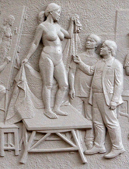 Phù điêu đặt ở lối vào trường từ tháng 9, mô tả không gian lớp học với mẫu khỏa thân, thầy giáo - giống thầy hiệu trưởng đương nhiệm - giảng bài và sinh viên đang thực hành. Tác phẩm là bài tốt nghiệp của học viên cao học khoa Điêu khắc - anh Nguyễn Xuân Vinh.