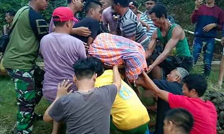 Cơ quan Tìm kiếm và Cứu hộ Kendari cùng dân làng di chuyển thi thể nạn nhân bị cá sấu cắn chết ở North Konawe, tỉnh Southeast Sulawesi, Indonesia, hôm nay. Ảnh: AFP.