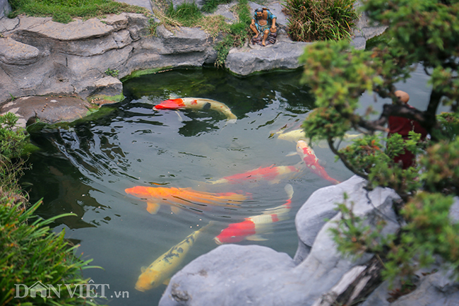 Chính giữa khu vườn là một hồ nước nhỏ nơi có đàn cá Koi tung tăng bơi lội, tạo khung cảnh sơn thủy hữu tình.