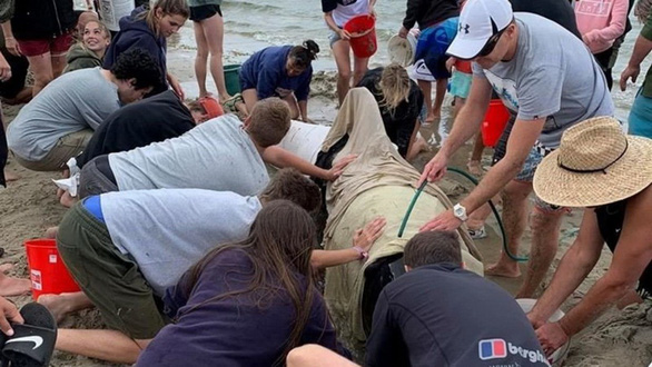 Cả ngàn người từ già trẻ, trai gái đã tập trung tại bãi biển giải cứu 11 con cá voi mắc cạn. Họ cùng nhau tưới nước cho con cá, 4 con chết đã được chôn cất tử tế.