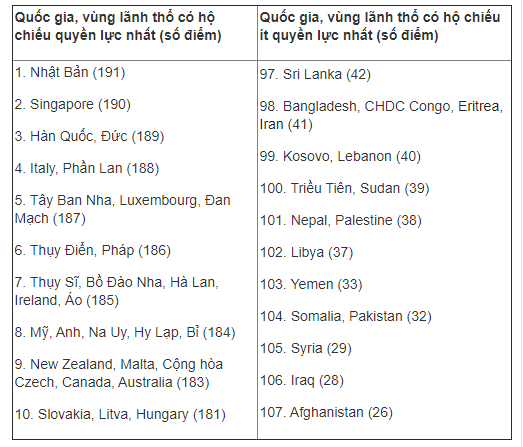 Bảng xếp hạng Henley Passport Index được công nhận và đánh giá cao nhất vì sử dụng dữ liệu từ Hiệp hội Vận tải Hàng không Quốc tế (IATA) và cung cấp hướng dẫn dễ dàng cho khách du lịch biết nơi nào họ có thể đến mà không cần xin visa.