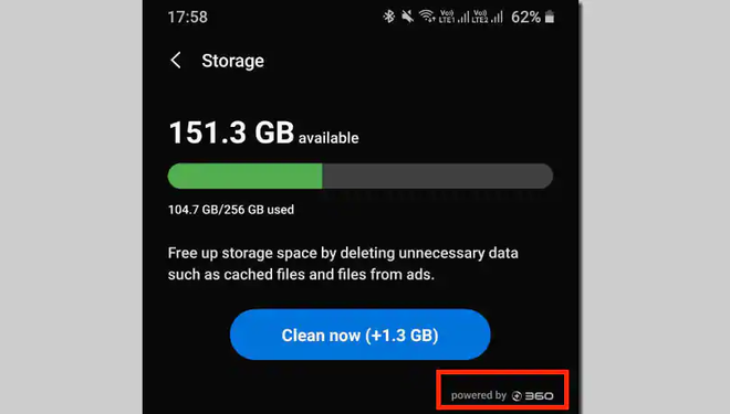 Bên dưới nút dọn dẹp trong ứng dụng mặc định của Samsung có dòng chữ hợp tác với công ty Qihoo 360 của Trung Quốc. Ảnh: BGR.