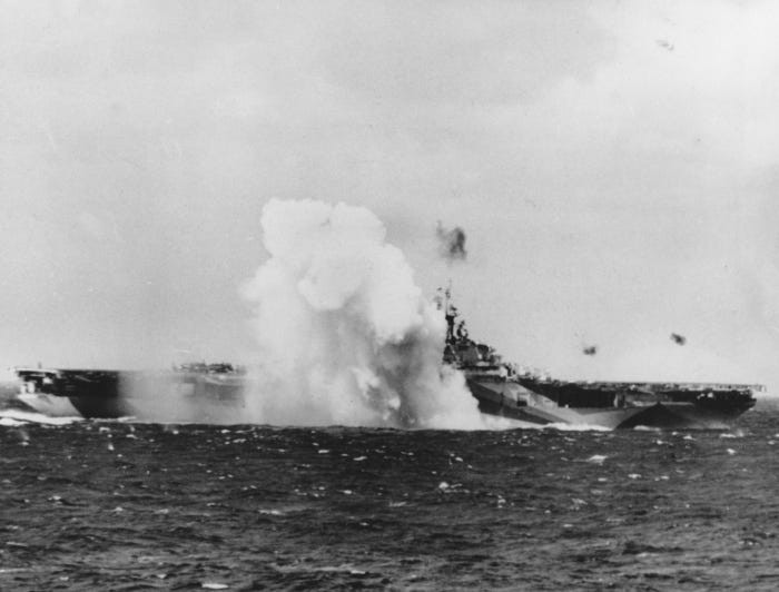 Chiến thuật sử dụng máy bay chiến đấu đâm cảm tử vào tàu chiến Mỹ của Nhật cũng khiến cho các tàu chiến Mỹ gặp khó khăn lớn trong việc sống sót qua trận đánh này. Nguồn ảnh: BI.