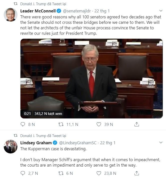 Khi phiên toàn luận tội ở Thượng viện Mỹ bắt đầu, Trump đăng Twitter đề cập thỏa thuận thương mại giai đoạn 1 vừa ký với Trung Quốc và ca ngợi Chủ tịch Tập Cận Bình thực sự yêu nước.