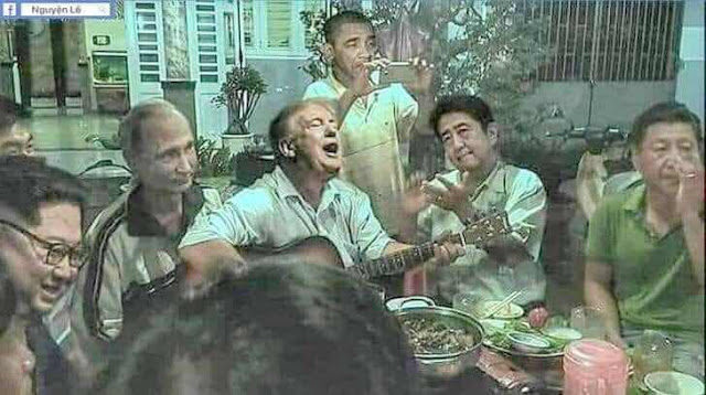 Số là năm Kỷ Hợi cũng sắp hết, các nguyên thủ quốc gia bèn tụ lại nhậu nhẹt. Anh Trump chủ xị, cầm đờn hát bản "Ly gượu mừng".