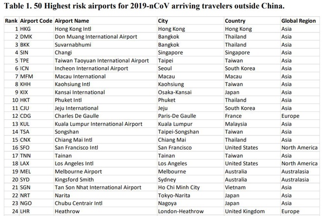 “Nhiều thành phố (trong danh sách nguy cơ) dù đã ghi nhận ca nhiễm nhưng vẫn nên chuẩn bị có thêm những ca nữa trong những ngày tới, nhiều khả năng từ các hành khách rời Vũ Hán trước khi lệnh cấm đi lại được ban hành ngày 23/1”, tiến sĩ Lauren Gardner viết.Ở Mỹ, các sân bay được nhóm nghiên cứu xác định là có nguy cơ cao đều đã được Trung tâm Kiểm soát và Phòng chống Dịch bệnh Mỹ (CDC) chỉ định kiểm soát chặt chẽ, bao gồm các sân bay ở Los Angeles, New York (John F. Kennedy) San Francisco, Atlanta (Hartsfield-Jackson) và Chicago (O’Hare).