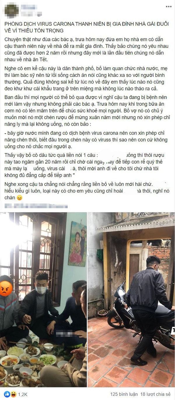 Theo đó, nhân dịp Tết Nguyên đán thì có một anh chàng đã về quê bạn gái để chúc Tết, đồng thời ra mắt gia đình sau 2 năm yêu nhau. Tuy nhiên, thời điểm này lại đang xảy ra dịch virus Corona nên anh chàng hết sức cảnh giác về việc phòng dịch. Vậy là ngay cả khi đến nhà người yêu thì anh chàng vẫn bịt khẩu trang kín mít. Ban đầu, mọi người cho rằng anh chàng bị bệnh nên không có ý kiến, tuy nhiên, khi biết được sự thật thì bố cô gái đã nổi giận.