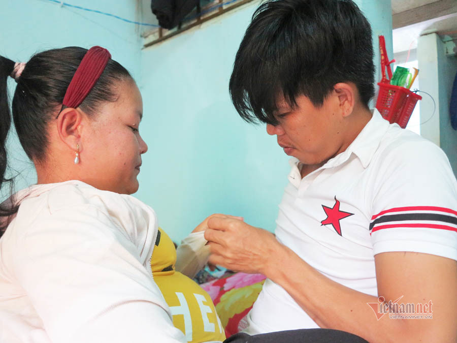 ‘Anh ấy nấu cơm, rửa chén bát, giặt quần áo, tắm rửa, chải đầu cho tôi. Là thanh niên nặng hơn 70 kg, cao hơn 1m7, chăm sóc tôi, giờ anh ấy ốm nhom’, Diễm nói, mắt nhìn chồng đang cặm cụi rửa chén bát, nhặt rau, vo gạo nấu cơm.