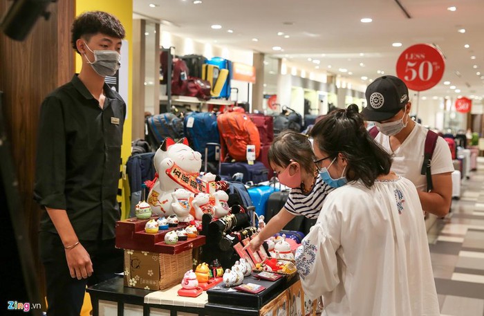 Số ít ỏi khách hàng đến đây để mua sắm. Tất cả từ nhân viên đến người mua đều trang bị khẩu trang y tế cho mình nhằm phòng dịch một cách an toàn nhất.