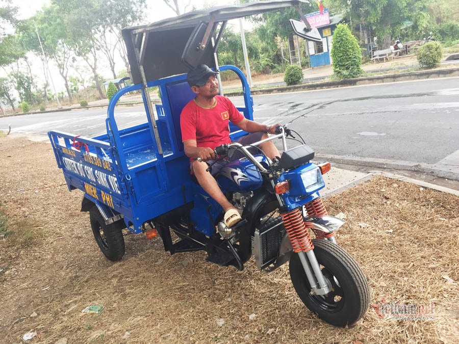 Việc đầu tiên là tôi mua chiếc xe ba bánh này với giá 40 triệu đồng. Tiếp đến tôi mua 200 vỏ ruột xe máy với giá 21 triệu. Từ nay ai đến bơm vá nếu cần thay vỏ ruột sẽ được miễn phí.