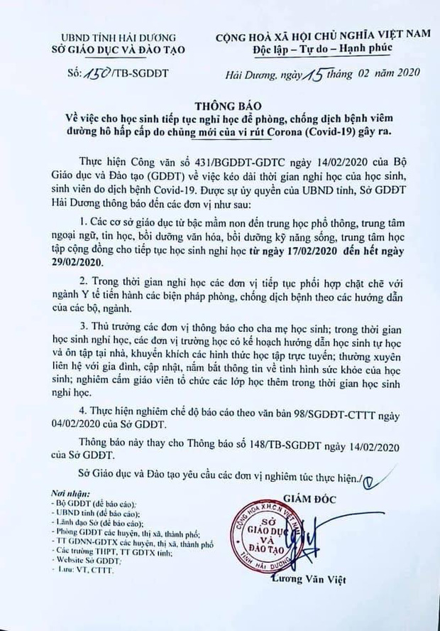 Trước đó, vào chiều ngày 14/2, Bộ trưởng Bộ GD&ĐT Phùng Xuân Nhạ đă kư công văn số 431/BGDĐT-GDTC - công văn hoả tốc gửi Chủ tịch UBND các tỉnh, thành phố trực thuộc Trung ương về việc kéo dài thời gian nghỉ học của học sinh, sinh viên, học viên do dịch Covid-19, xem xét cho học sinh, sinh viên, học viên toàn quốc nghỉ học đến hết tháng 2/2020.