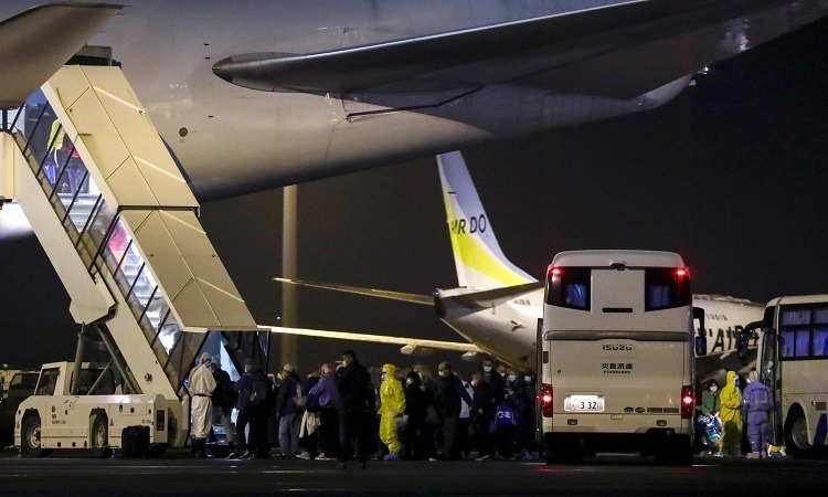 Công dân Mỹ từ tàu Diamond Princess lên máy bay về Mỹ tại sân bay Haneda ở Tokyo, Nhật Bản, rạng sáng nay. Ảnh: Reuters.
