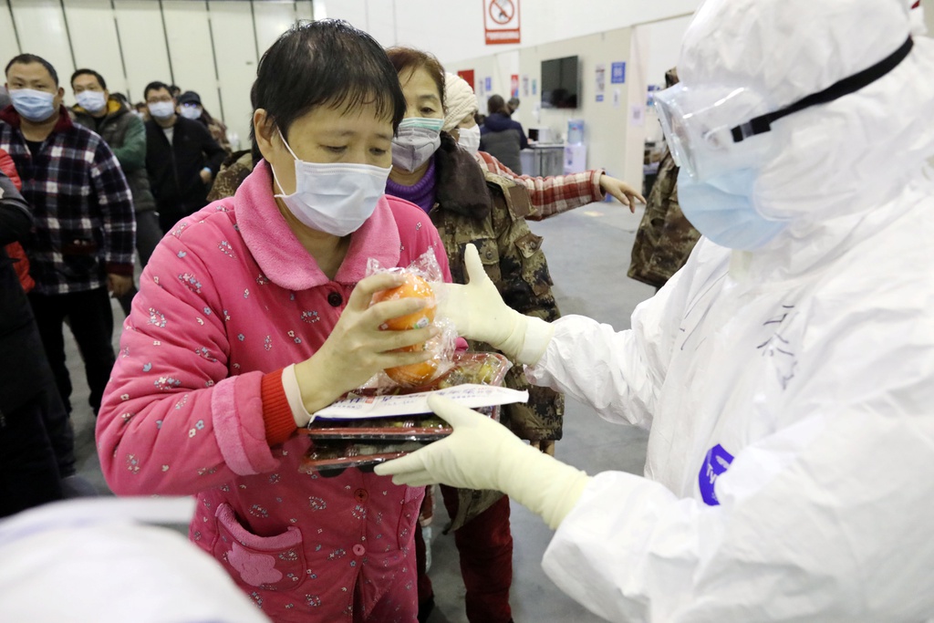 Bệnh nhân nhận thức ăn trưa tại một bệnh viện dã chiến ở Vũ Hán. Ảnh: Reuters.