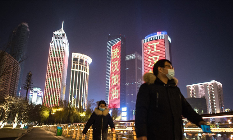 Các tòa nhà ở Vũ Hán, thủ phủ tỉnh Hồ Bắc, Trung Quốc chiếu các khẩu hiệu cổ vũ người dân giữa dịch Covid-19. Ảnh: Xinhua.