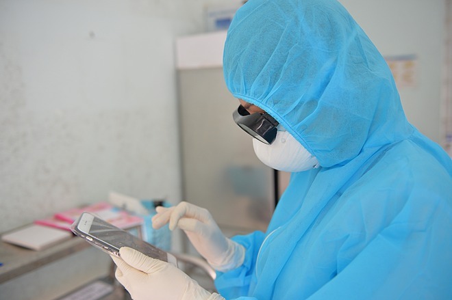 Điều dưỡng tại phòng khám đa khoa Quang Hà, BÌnh Xuyên, Vĩnh Phúc, chụp mẫu xét nghiệm bệnh nhân dương tính gửi báo cáo. Ảnh: Giang Huy.