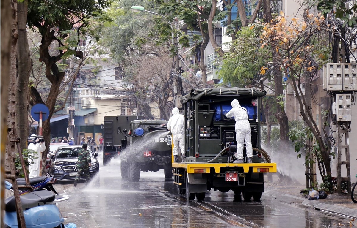 Ngay trong sáng 7/3, Binh chủng Hóa học phối hợp Cục Quân y (Tổng cục Hậu cần, Bộ Quốc phòng) đã triển khai lực lượng đến khu vực các phố Trấn Vũ, Trúc Bạch và các phố xung quanh ở quận Ba Đình, Hà Nội để phun thuốc tiêu độc, khử trùng.