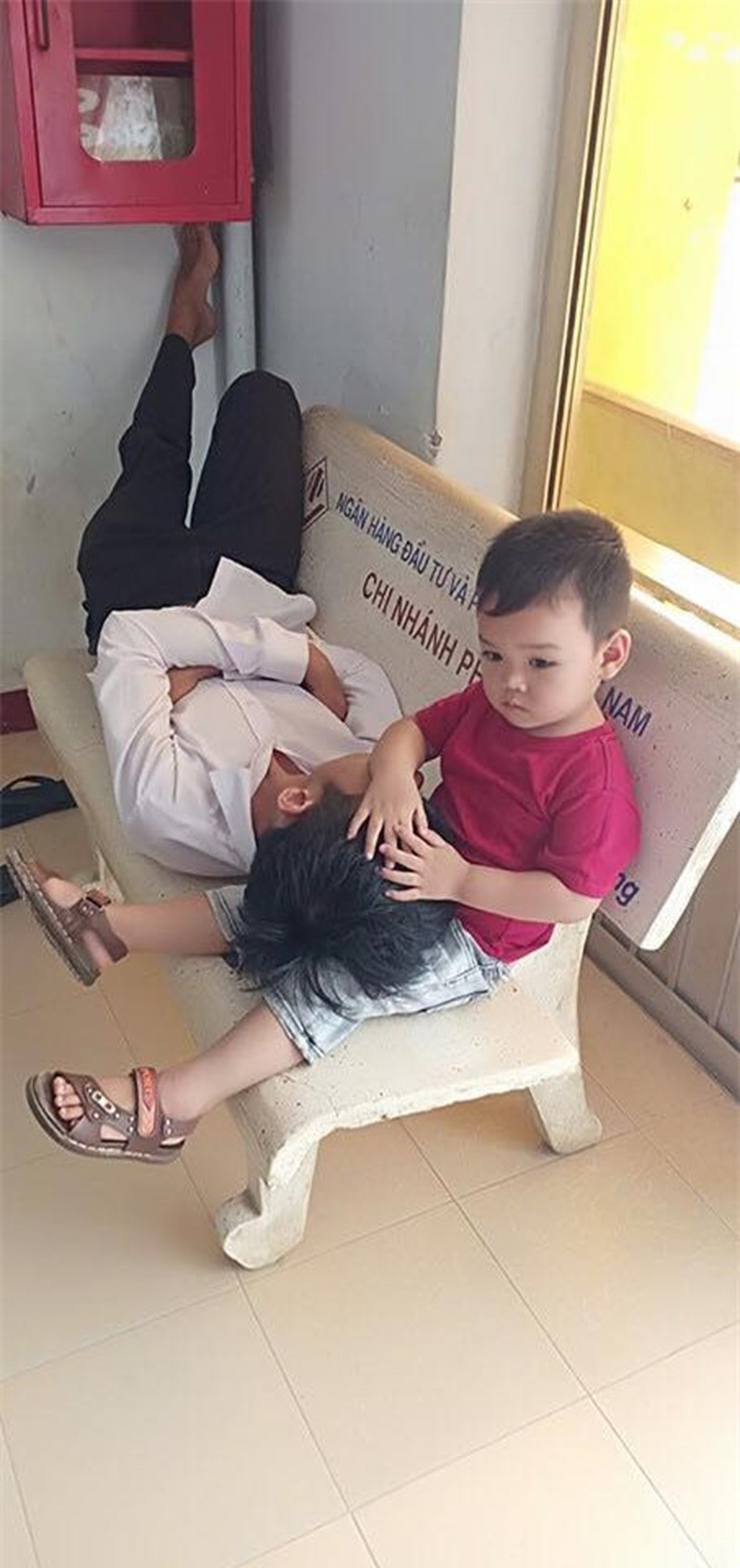 Hóa ra là ông cậu được nhờ trông cháu nhưng cơn buồn ngủ "ập đến" thì biết làm sao? Thôi thì đành “giam lỏng” nó bằng việc lấy chân làm gối đầu và đánh một giấc no say đã. Đúng là một công đôi việc còn gì? Thằng cháu quả này có mà chạy đằng trời!