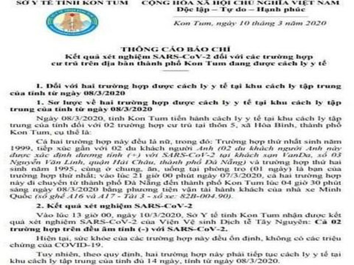 Cơ quan y tế tỉnh Kon Tum đã lấy mẫu gửi Viện Vệ sinh dịch tễ Tây Nguyên để làm xét nghiệm, kết quả, xác định lãnh đạo tỉnh và ba cán bộ âm tính nCoV.
