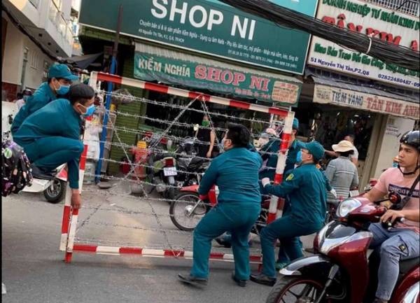 Kèm theo bà*i viết là hình ảnh lực lượng chức năng đang lập rào chắn trước một con hẻm ở đường Nguyễn Thị Tần, thuộc P.2, Q.8.