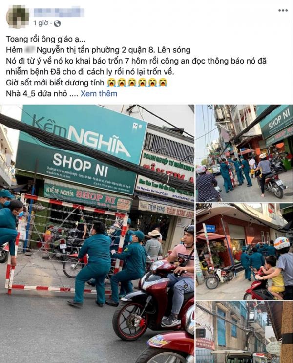 Sáng 17.3, tài khoản M.N đăng trên trang Facebook cá nhân của mình thông tin một người từ Ý nhi*ễm Covid-19 nhưng trố*n cách ly. Người này viết: "Toang rồi ông giáo ạ. Hẻm... Nguyễn Thị Tần, P.2, Q.8 (TP.HCM) lên sóng. Nó đi từ Ý về nó không khai báo trố*n 7 hôm rồi công an đọc thông báo nó đã nhi*ễm bện*h. Đã cho đi cách ly rồi nó lại trố*n về. Giờ sốt mới biết dươ*ng tín*h. Nhà 4-5 đứa nhỏ. Làm ơn có ý thức dùm. Người lớn không sao con nít sao chịu nổi".