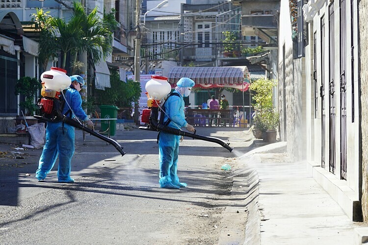 Nhân viên y tế phun thuốc khử trùng khu phố ở Bình Thuận có người nhiễm nCoV. Ảnh: Việt Quốc.