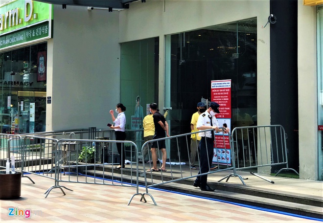Tại khu vực phong tỏa, lực lượng bảo vệ của khu đô thị được bố trí với số lượng lớn. Tài xế xe ôm công nghệ dừng đỗ tại đây được nhắc nhở đeo khẩu trang và hạn chế đến gần khu vực.