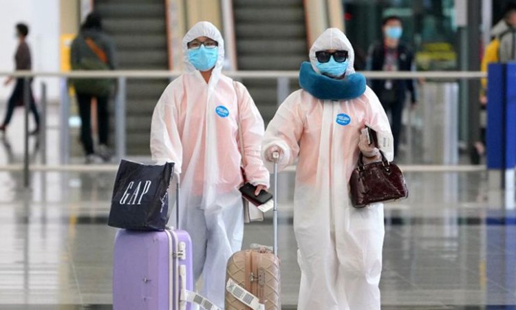 Hành khách mặc đồ bảo hộ tại sân bay Hong Kong hôm 18/3. Ảnh: CNN.